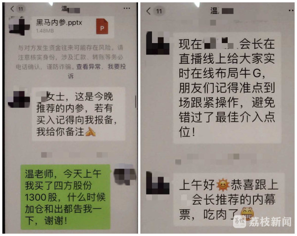 温某告诉刘女士,他有一个专业的炒股团队,并和刘女士讨论起了股市行情。发现温某讲得头头是道,刘女士逐渐放松了警惕。在对方介绍下,刘女士跟着多名团队“讲师”学习炒股知识,认真研读起了团队“会长”的文章。