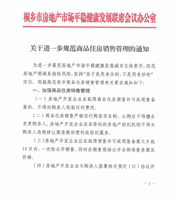7月7日,澎湃新闻(www.thepaper.cn)从浙江省嘉兴市房地产业协会获悉,桐乡市7月5日发布《关于进一步规范商品住房销售管理的通知》,进一步加码楼市调控。