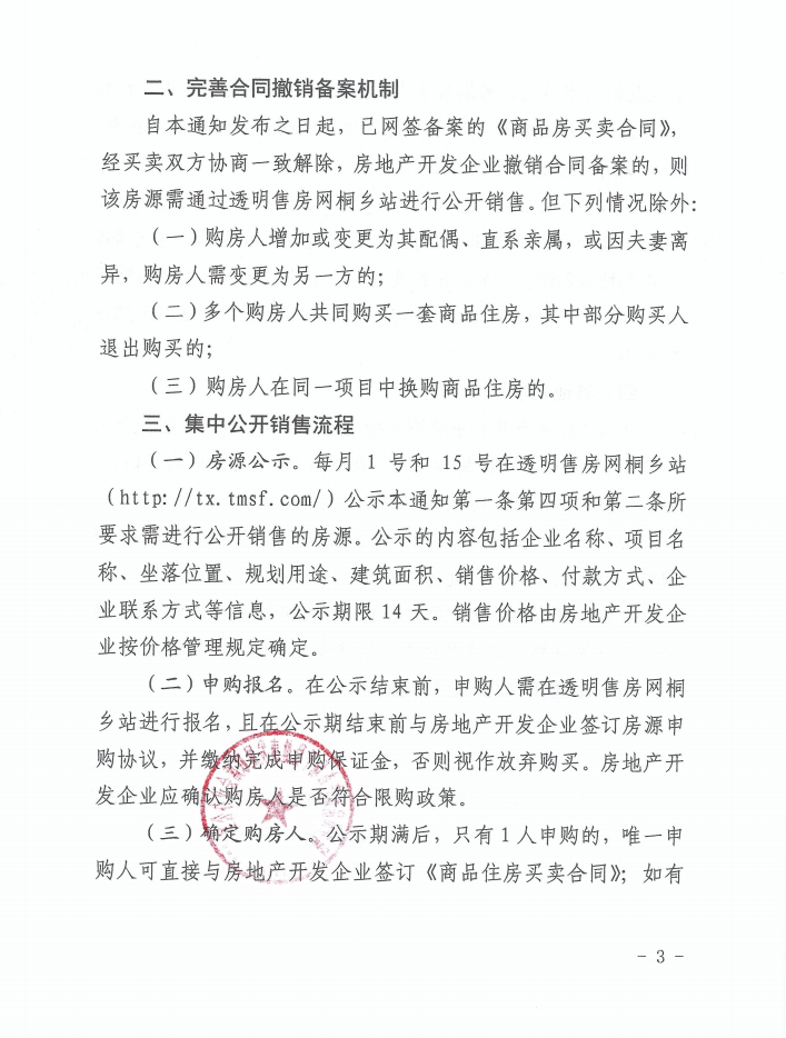 在完善合同撤销备案机制方面,自该通知发布之日起,已网签备案的《商品房买卖合同》经买卖双方协商一致解除,房地产开发企业撤销合同备案的,则该房源需通过透明售房网桐乡站进行公开销售。