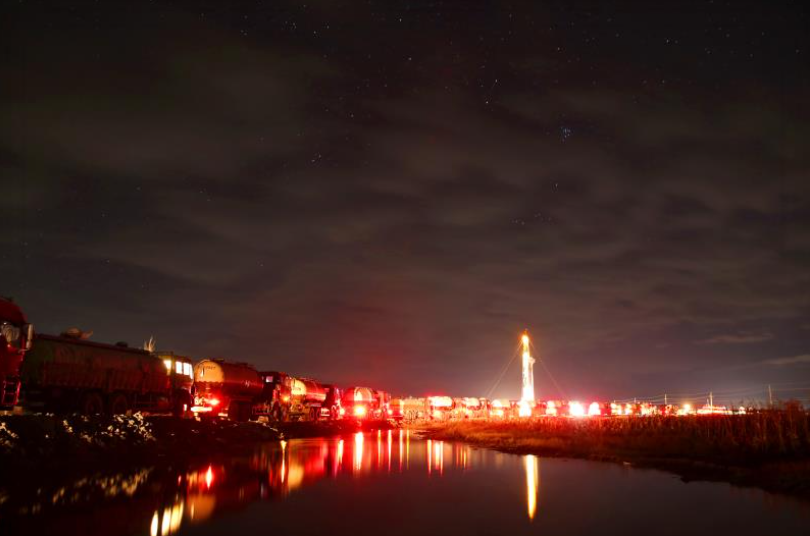 大庆钻探钻技一公司进行夜间固井施工。 于馨 摄