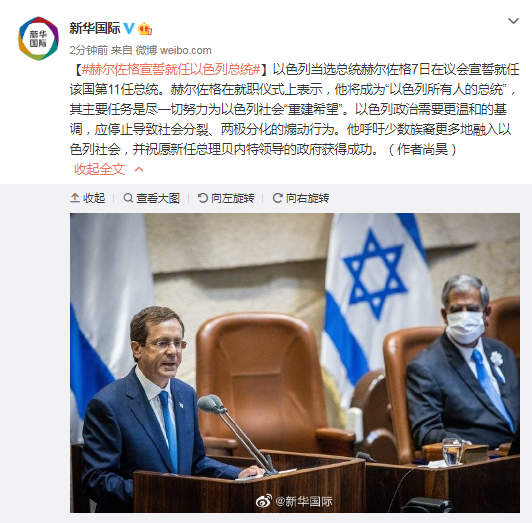 以色列当选总统赫尔佐格7日在议会宣誓就任该国第11任总统。赫尔佐格在就职仪式上表示,他将成为“以色列所有人的总统”,其主要任务是尽一切努力为以色列社会“重建希望”。以色列政治需要更温和的基调,应停止导致社会分裂、两极分化的煽动行为。他呼吁少数族裔更多地融入以色列社会,并祝愿新任总理贝内特领导的政府获得成功。