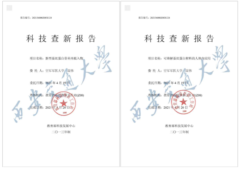 技术查新显示,国际尚无蚕丝蛋白材料在人体内骨科应用的临床实例。该项目已正式通过西京医院学术委员会和科研伦理委员会审批,进入临床试验阶段。2020年受邀参加在上海召开的全球技术转移大会,是陕西省唯一参展的医疗产品。