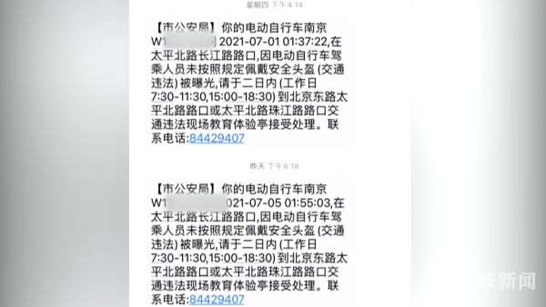 南京市民古女士这两天接连收到两条电动自行车违法告知短信,提示她名下一辆W开头的外卖牌照电动自行车,在南京市内两处地点有交通违法行为被电子曝光,请谷女士到指定交警岗亭接受处理。