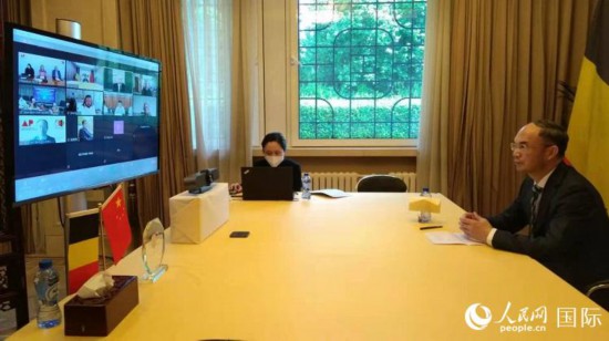中国驻比利时大使曹忠明参加线上签约仪式。记者 郑彬摄