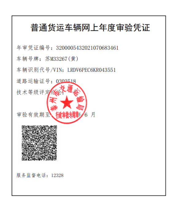 泰州市政务服务中心交通运输局窗口了解到长城公司的这一特殊情况后,主动联系企业帮助排忧解难。窗口工作人员通过电话联系到公司车辆负责人,告知其车辆可以在河北进行检测,检测机构将检测信息上传至交通运输部平台。该公司车辆全部检测合格后,窗口工作人员帮助企业在交通运输部“互联网道路运输便民政务服务系统”注册用户名,然后指导企业在系统提交年审申请,将年审材料以附件形式上传至系统。窗口工作人员在江苏运政系统对年审材料进行审核,审核通过后,生成年审凭证并加盖电子印章。该公司通过“互联网道路运输便民政务服务系统”查询办件进度,自行下载打印年审凭证。最终,该公司24辆普货运输车辆半小时内全部通过网上办理了年审业务。