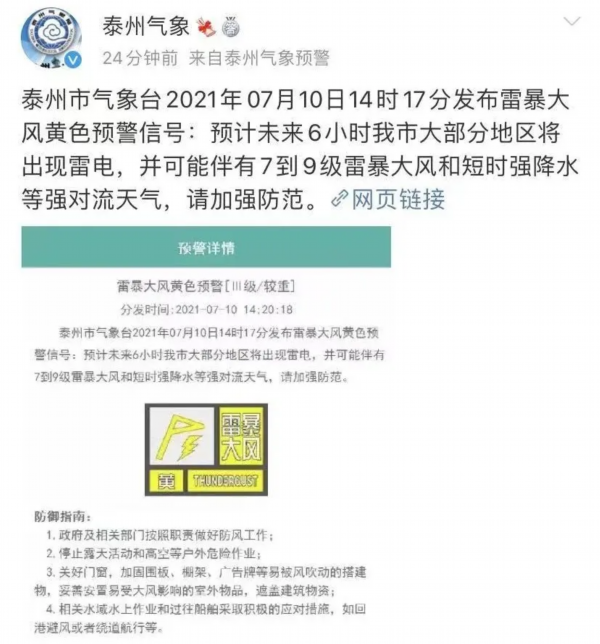 错啦!!!泰州气象今日14时17分发布雷暴大风黄色预警信号:预计未来6小时我市大部分地区将出现雷电,并可能伴有7到9级雷暴大风和短时强降水等强对流天气。