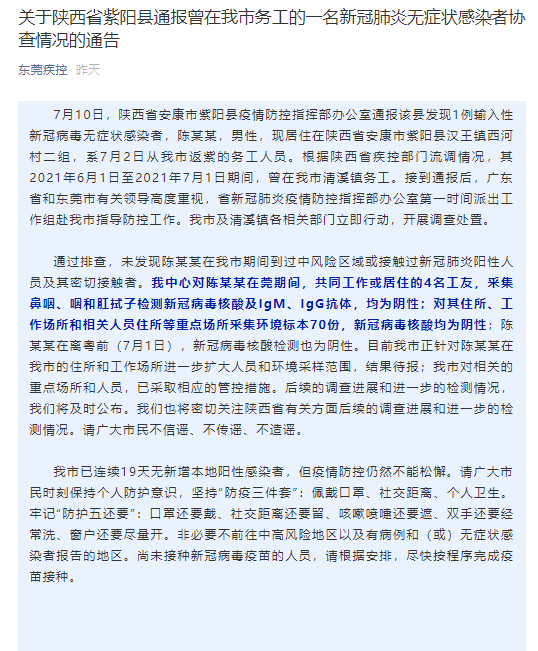 荔枝新闻讯 微信公号“东莞疾控”7月10日消息,东莞市疾病预防控制中心10日通报,当日,陕西省安康市紫阳县疫情防控指挥部办公室通报该县发现1例输入性新冠病毒无症状感染者,陈某某,男性,现居住在陕西省安康市紫阳县汉王镇西河村二组,系7月2日从东莞市返紫的务工人员。根据陕西省疾控部门流调情况,其2021年6月1日至2021年7月1日期间,曾在东莞市清溪镇务工。接到通报后,广东省和东莞市有关领导高度重视,省新冠肺炎疫情防控指挥部办公室第一时间派出工作组赴东莞市指导防控工作。东莞市及清溪镇各相关部门立即行动,开展调查处置。