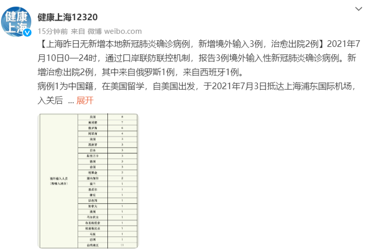荔枝新闻讯 据“健康上海12320”官微消息,2021年7月10日0—24时,通过口岸联防联控机制,报告3例境外输入性新冠肺炎确诊病例。新增治愈出院2例,其中来自俄罗斯1例,来自西班牙1例。