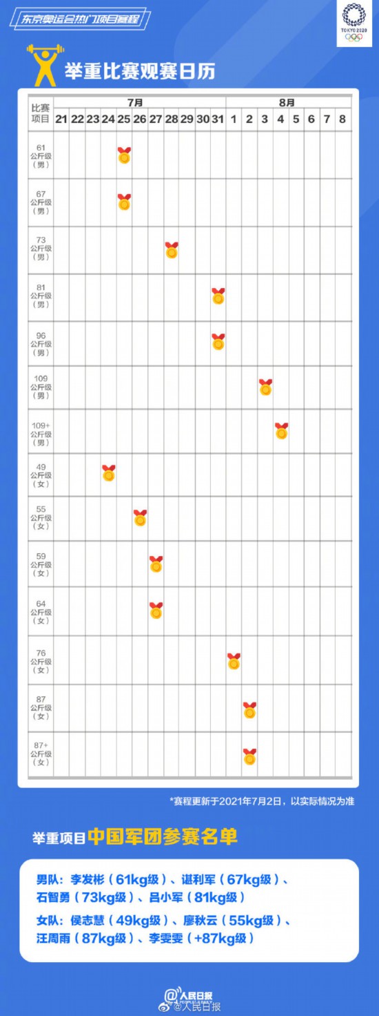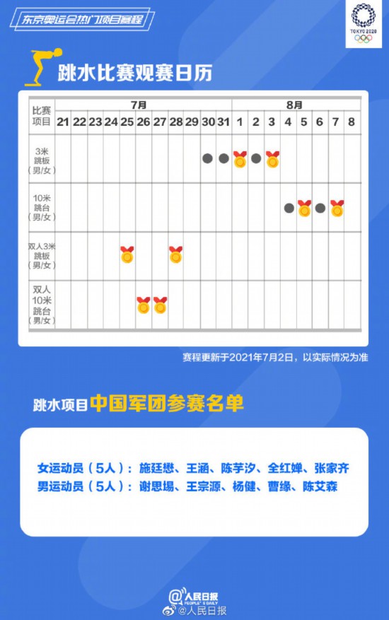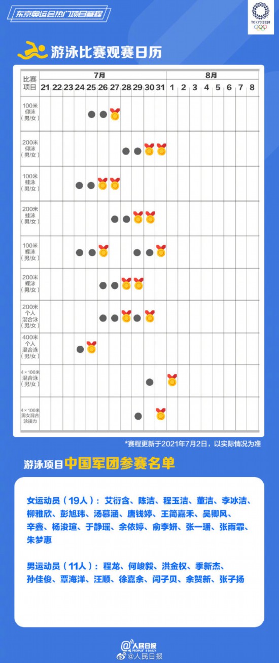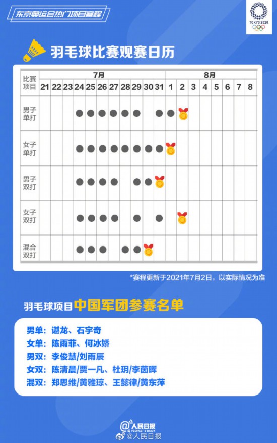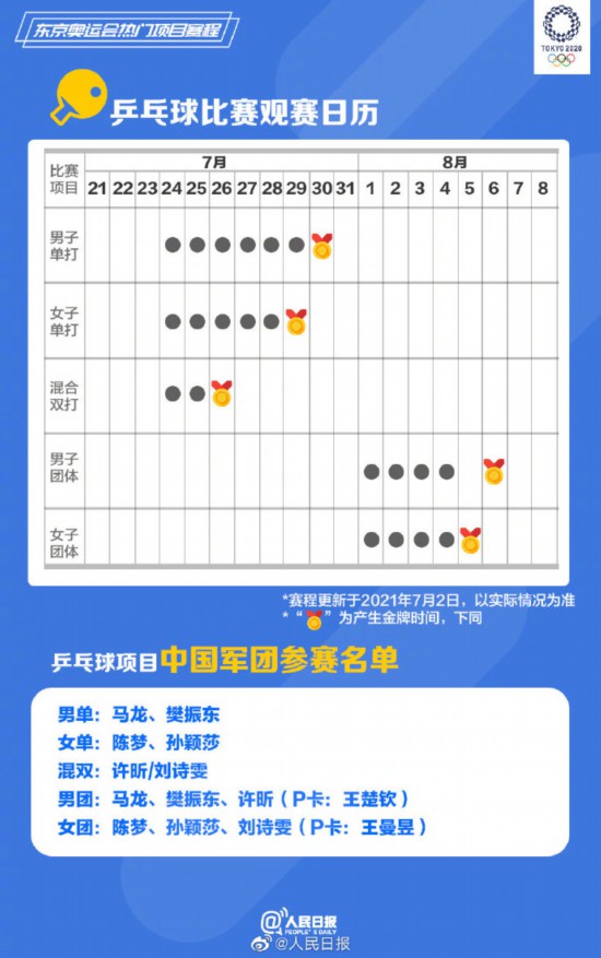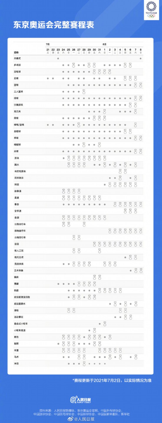 【速速收藏!东京奥运会热门项目观赛日历来了 为中国运动员加油!】距东京奥运会开幕只剩不到两周,中国多个项目代表队公布奥运名单。乒乓球、羽毛球、跳水、游泳、女排…你关注的比赛什么时候进行?将在哪天产生金牌?有你喜爱的运动员吗?收藏东京奥运会赛程↓一起看奥运,中国队,加油!