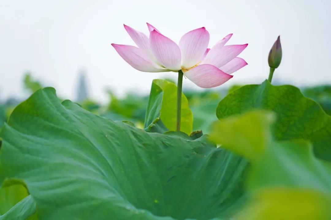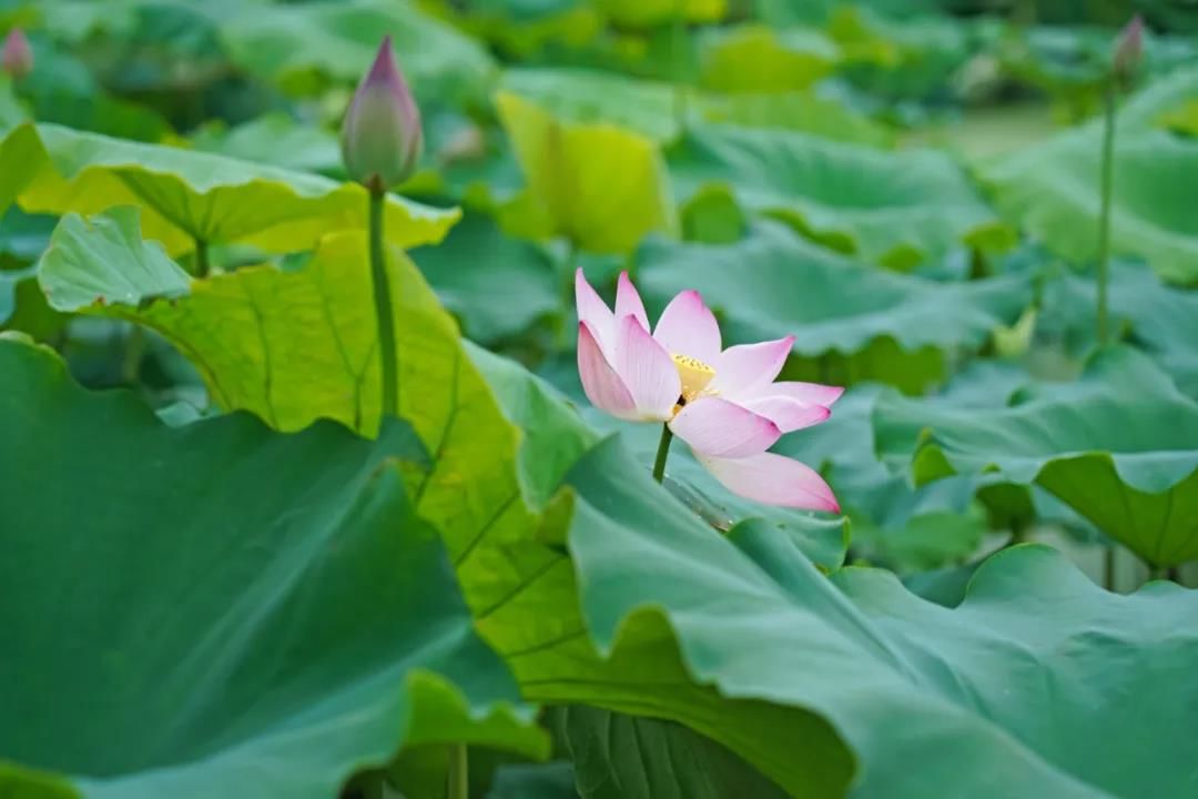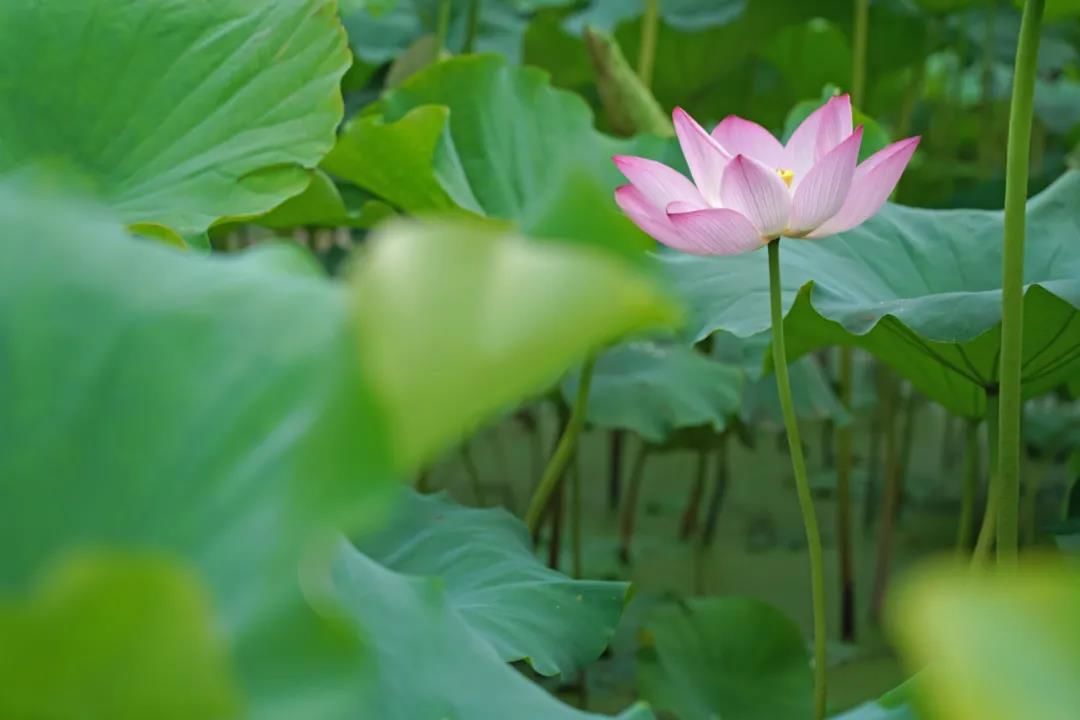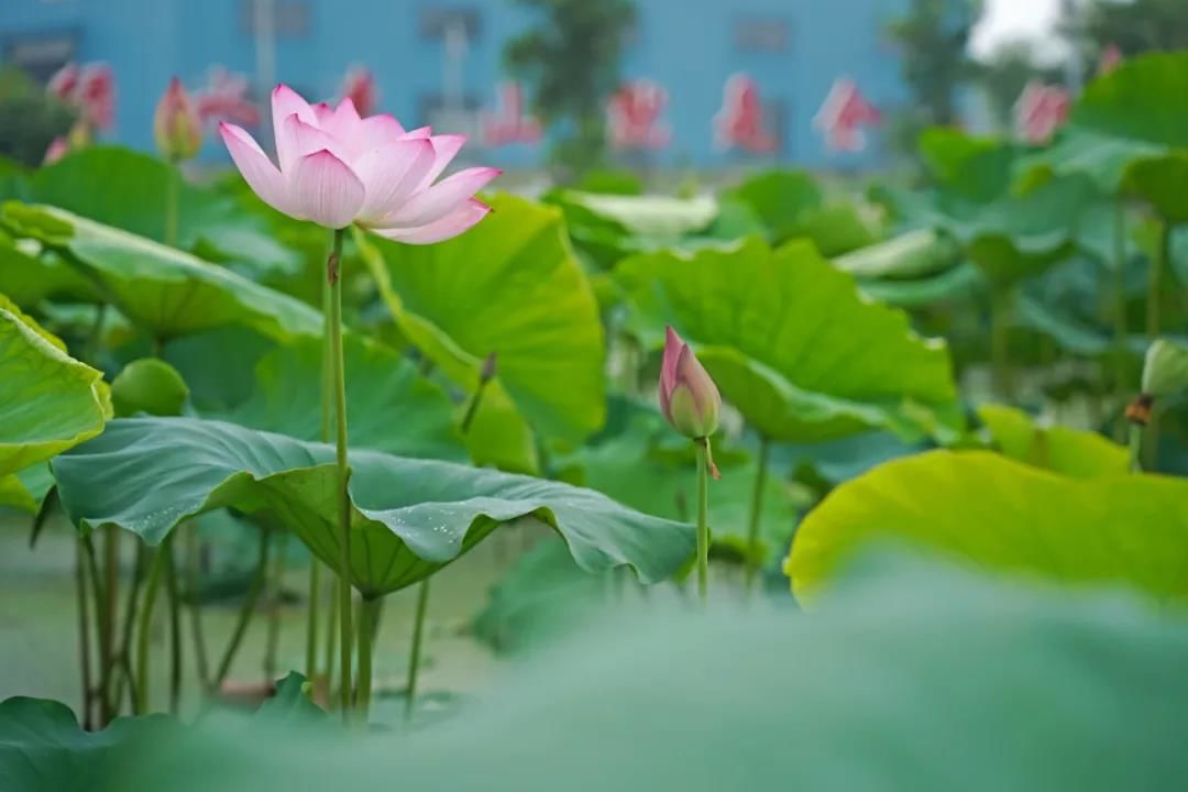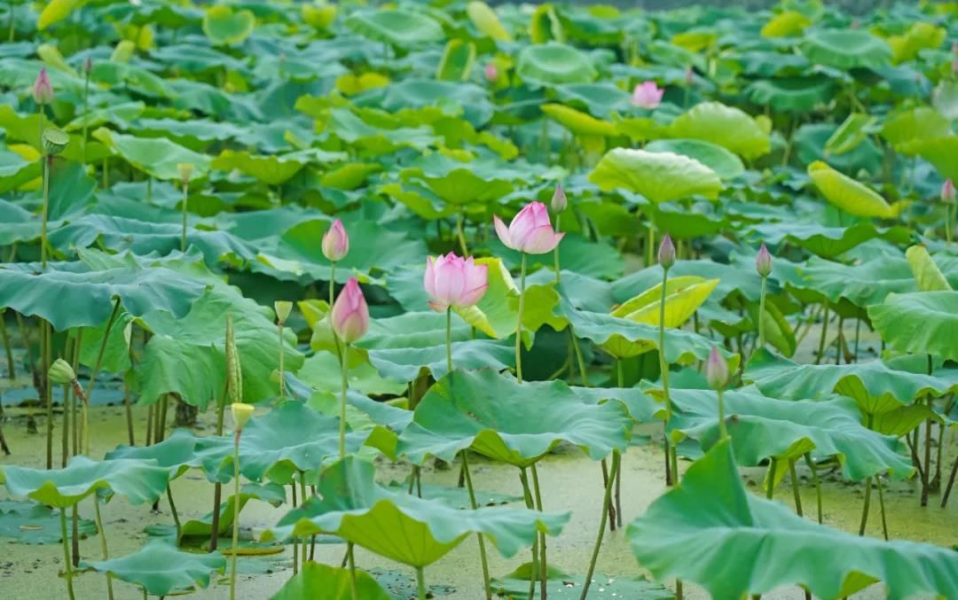沿着许五子桥一路北下,一片荷塘跃入眼帘。荷叶如盖,层层叠叠,百亩荷塘,就像一片绿海。在“绿海”上,朵朵荷花冒出“海”面,亭亭玉立,别样娇红。