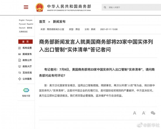 据商务部网站7月11日消息,针对美国商务部近日将23家中国实体列入出口管制“实体清单”,商务部新闻发言人11日答记者问表示,美方泛化国家安全概念,滥用出口管制措施,罔顾事实,再次以所谓“人权”等为由,将23家中国实体列入“实体清单”。这是对中国企业的无理打压,是对国际经贸规则的严重破坏,中方坚决反对。美方应立即纠正错误做法。我们将采取必要措施,坚决维护中方合法权益。