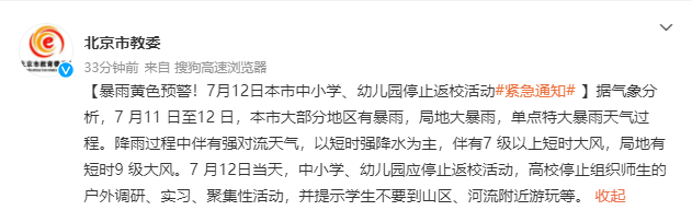 7月12日当天,中小学、幼儿园应停止返校活动,高校停止组织师生的户外调研、实习、聚集性活动,并提示学生不要到山区、河流附近游玩等。