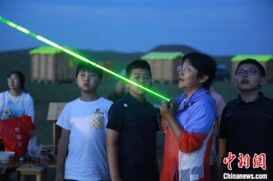 在没有灯光打扰的草原,黑夜幽远静谧,抬头即是垂落天幕的银河和漫天星辰。星空下,十几位游客围在讲解员周围,顺着她手中激光笔找寻星座的方向,夜幕下的草原里,只闻孩童般的阵阵欣喜轻呼。