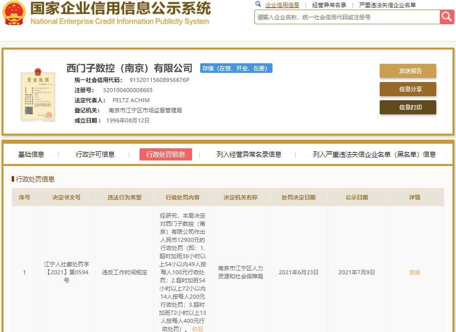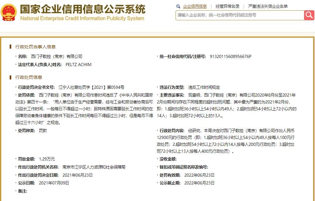 经研究,南京市江宁区人力资源和社会保障局决定对西门子数控(南京)有限公司作出人民币12900元的行政处罚(即:1.超时加班36小时以上54小以内49人按每人100元行政处罚;2.超时加班54小时以上72小以内14人按每人200元行政处罚;3.超时加班72小时以上13人按每人400元行政处罚)。