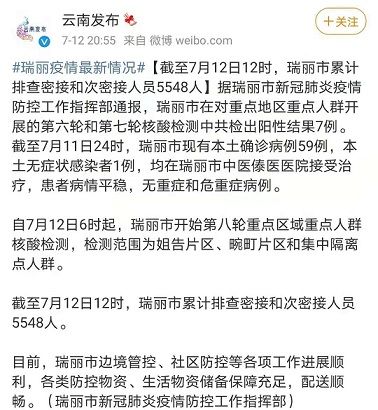 截至7月12日12时,瑞丽市累计排查密接和次密接人员5548人。