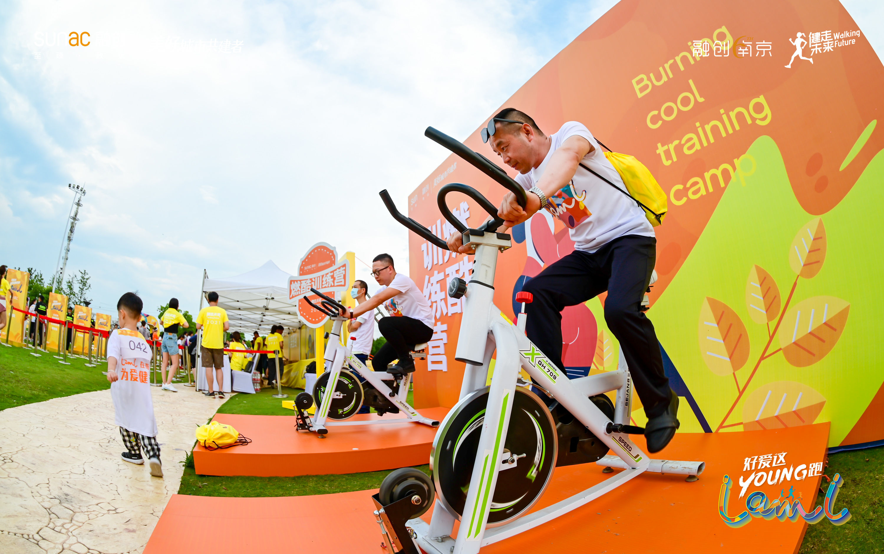 此刻的鱼嘴公园里到处都是身着鲜艳的文化衫跑者:情侣们穿戴起个性十足的装备,各自摆出不一样的POSE,用肢体语言尽情地表达他们对于“健走未来”活动的热情与期待;一家老少齐上阵,带上娃娃在主题背景板前打卡留念;热爱运动的青年们,纷纷选择在燃酷训练营的动感单车上留下自己热血的身姿……现场的每一个人都在尽情展现出“I AM I”的独特风采。