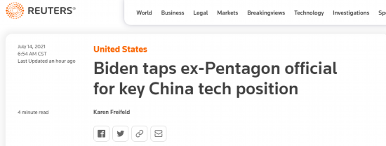 路透社消息,美国总统拜登当地时间7月13日提名前五角大楼官员艾伦 埃斯特韦斯担任美国商务部副部长,负责工业和安全事务。路透社称,这是美中科技战中的一个关键职位。