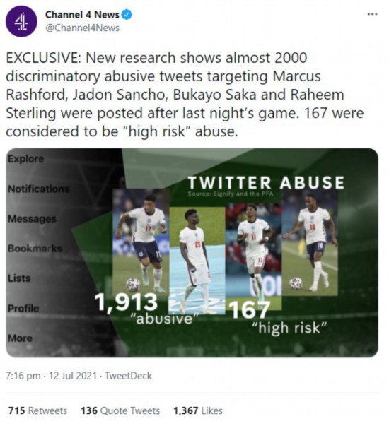 英国公共服务电视台(Channel 4)在12日进行的最新调查发现,在决赛结束后的几小时内,英国网友在社交媒体上发布了近2000条针对拉什福德、桑乔、萨卡,甚至还包括斯特林在内的辱骂性推文,其中有167条被认为是“高风险”种族歧视滥用。