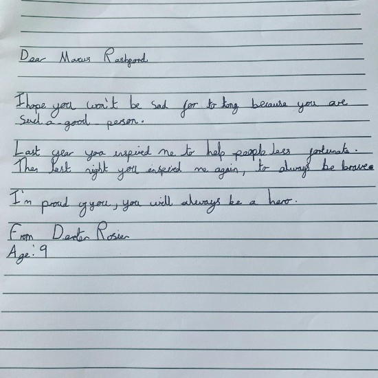 一个名叫罗希尔的9岁小姑娘,是被拉什福德慈善项目救助的对象。她在作业纸上写道:“亲爱的拉什福德叔叔,我希望你别悲伤太久,你是一个心地善良的好人。去年,你激励我去帮助命运中不幸的人。昨夜,你的表现再一次激励我要勇敢坚持。我为你而自豪,你永远是英雄。9岁的罗希尔。”