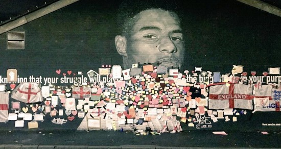 在曼彻斯特威辛顿街区,英超球队曼联的明星球员拉什福德的壁画也遭到种族主义者的污损。当地民众自发组织起来遮住污损痕迹,同时强烈谴责这种破坏和侮辱行为。