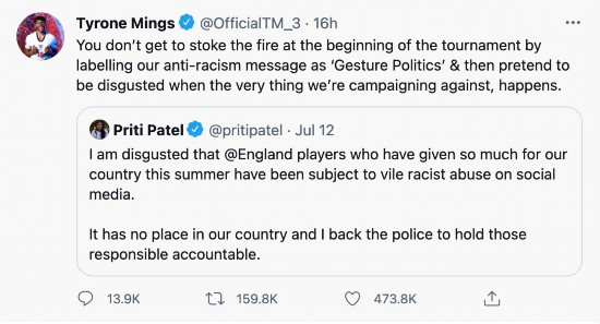 明斯表示,就连英国政府也在“煽动种族主义的仇恨之火”。此前在赛前,球员们单膝跪地以此纪念被白人警察“跪颈杀”的非洲裔人弗洛伊德,当时英国内政大臣普里蒂·帕特尔称这种行为是“政治姿态”,并拒绝谴责对他们发出嘘声的球迷。现在她又发声表示谴责对球员进行种族歧视的人。明斯在推特上发声表示,“你不能在比赛开始时给大家单膝跪地的反种族主义行为贴上‘政治姿态’的标签,然后在当下集体谴责种族歧视的时候做违心表态反对种族歧视。”