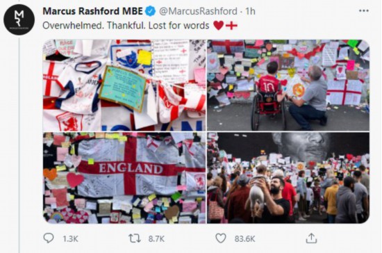 当地时间13日晚间,23岁的英格兰前锋马库斯·拉什福德在社交媒体上对依然支持他的球迷发声,“非常感动!万分感谢!无法言表!最后配了‘爱英格兰’的图标。”