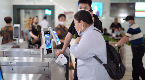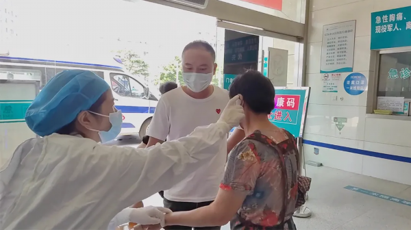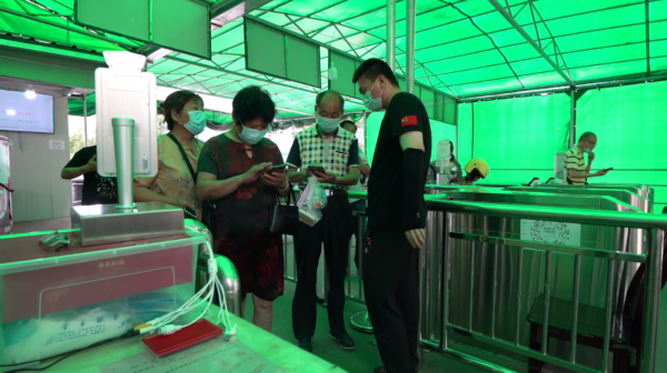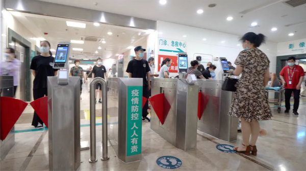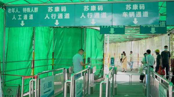 早上9点,市人民医院西门入口处秩序井然,市民依次排队通过电子道闸,经核验苏康码、刷脸测量体温正常后进入医院,入口的电子显示屏上实时滚动更新全国中高风险地区名单,提醒市民予以关注。在电子道闸的右侧,几位老人在工作人员的帮助下,进行身份登记,并通过简单的询问记录近期行程;没有苏康码的外省人员则需核验行程码方能进入。工作人员不时提醒进入人员一定要规范佩戴口罩。高温炙烤,尽管有风扇吹凉,他们额头的汗水还是在不停滴落。