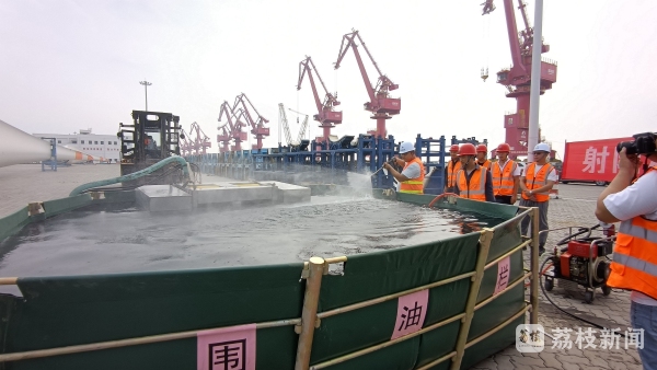 演习模拟一艘污油回收船舶在射阳港通用码头进行污油驳油时,因管道泄漏,造成约1吨污油沿着船壁流入港内,并迅速向外扩散。