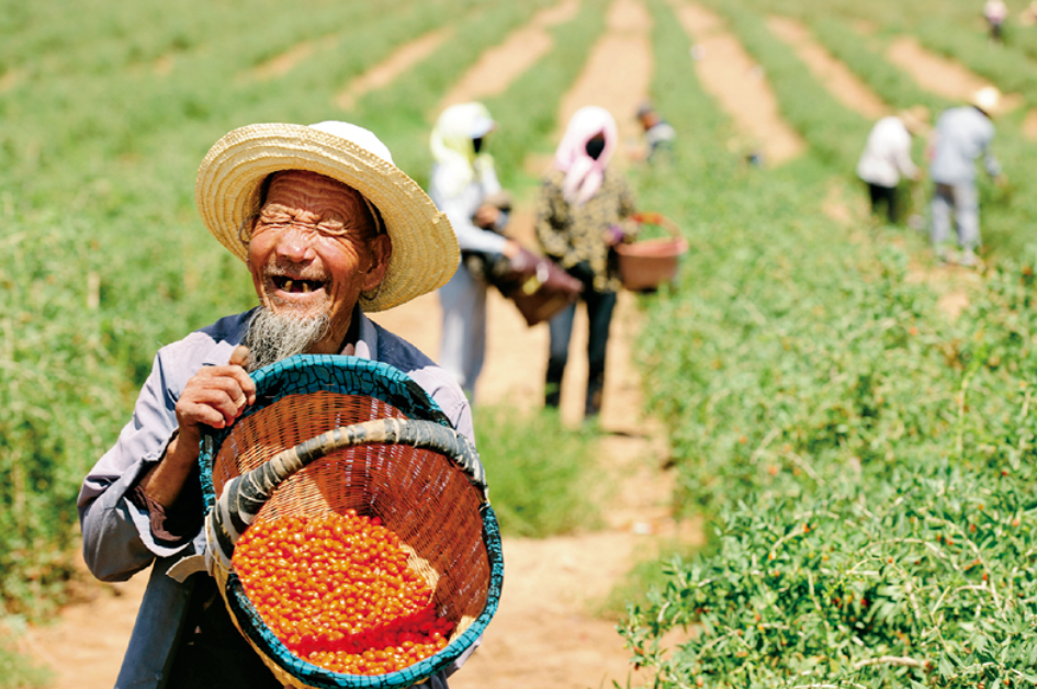 闽宁两省区成功实现了援助式扶贫向开发式扶贫转变。福建的人才、资金、技术、市场等要素与宁夏贫困地区的土地、特色农产品和劳动力资源有机结合,带动了当地现代农业和特色优势产业的发展。一个个特色优势产业集群正在改变着西海固落后的生产结构和传统的生活方式。图为2018年9月19日,同心县农民种植的枸杞喜获丰收。 宁夏区委宣传部供图 李君杰/摄