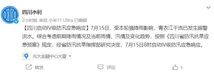 荔枝新闻讯 据@四川水利官方微博消息,7月15日,受本轮强降雨影响,青衣江干流已发生超警洪水。综合考虑前期降雨情况及当前雨情、汛情及变化趋势,按照《四川省防汛抗旱应急预案》规定,经四川省防汛抗旱指挥部研究决定,7月15日8时四川启动IV级防汛应急响应。