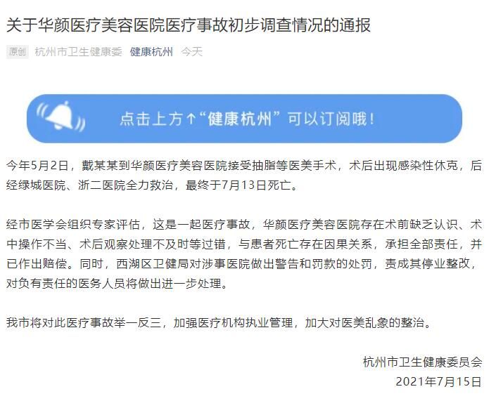 荔枝新闻讯 7月15日,杭州卫健委发布关于华颜医疗美容医院医疗事故初步调查情况的通报。
