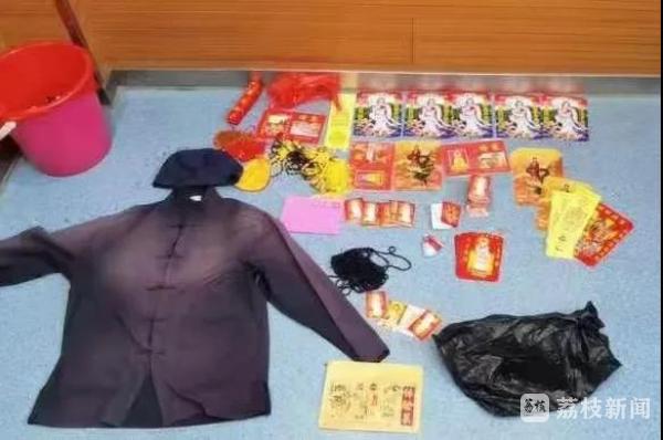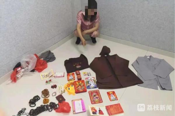 接报后,民警迅速调取周边的监控视频,很快锁定了犯罪嫌疑人和落脚点,一举抓获假冒和尚、尼姑实施封建迷信诈骗的代某某和左某某共计8人,现场查获假僧衣僧帽、假铜钱、假金器,假证书等物200余件。