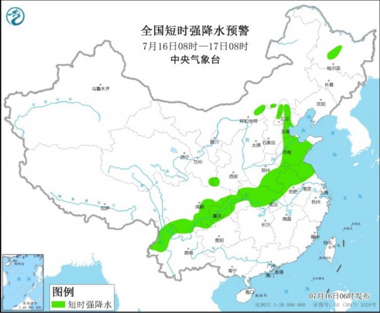 预计7月16日08时至17日08时,内蒙古中西部、山东中北部和南部、河南东南部、安徽中北部、江苏中北部、湖北北部、四川中南部等地的部分地区将有8-10级雷暴大风或冰雹天气;内蒙古中部、黑龙江西南部、陕西南部、河北东部、北京北部、天津、山东、河南东部和南部、安徽北部、江苏北部、湖北、四川东部和南部、重庆、贵州北部、云南西部等地的部分地区将有短时强降水天气,小时雨量20-50毫米,局地可达70毫米以上。