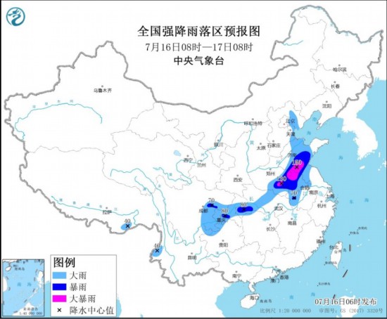 预计,7月16日08时至17日08时,华北东部、黄淮东部和南部、江淮、江汉中部、四川盆地中南部等地有大到暴雨,其中,山东南部、河南东部、安徽北部、江苏西北部等地的部分地区有大暴雨(100~150毫米)。上述部分地区伴有短时强降水(最大小时降雨量20~50毫米,局地可超过60毫米),局地有雷暴大风或冰雹等强对流天气。