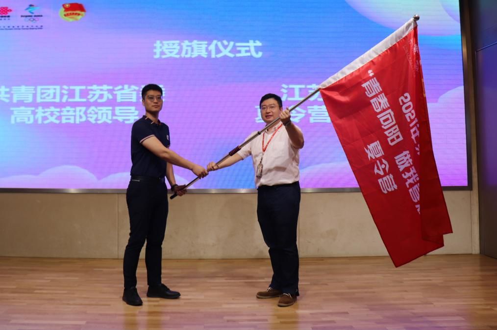 在南理工和南师大的两位优秀营员分享后,在各位营员铿锵有力的宣誓词中,团省委领导将第九届夏令营的旗帜授予江苏联通夏令营执行官的手中,2021年夏令营正式启动!