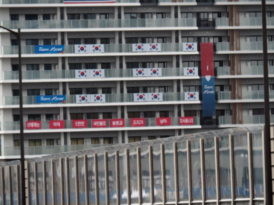 近日,东京奥运会韩国代表团选手村宿舍外悬挂的国旗和横幅引发一些日本网友争议。