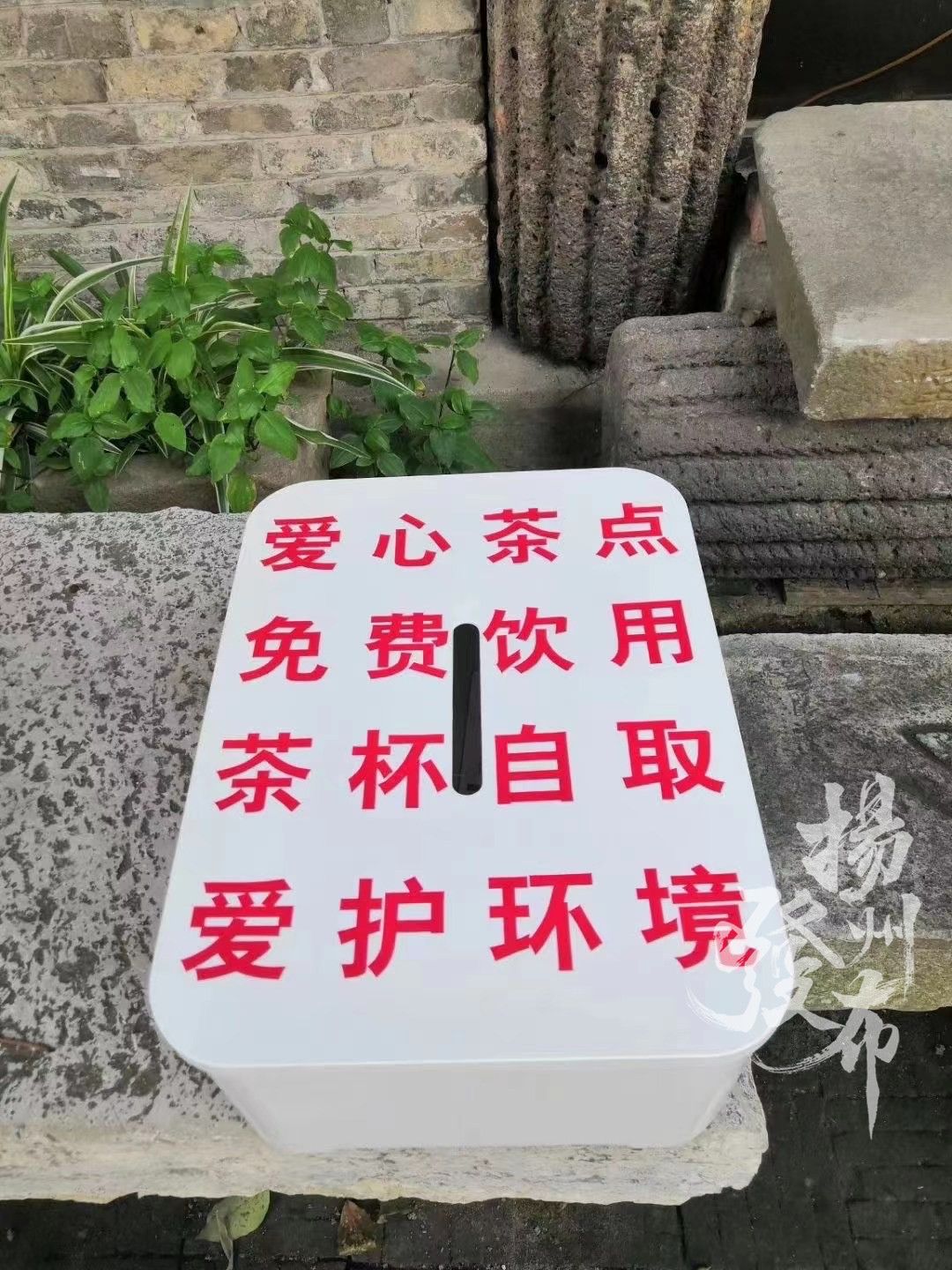 简易的架子上,摆放着一个干净的茶水桶,“爱心茶点免费饮用,茶杯自取,爱护环境”的红色提醒语十分显眼。今天上午,在扬州网红街区皮市街边城书店门口,一个爱心茶水点正式开放。