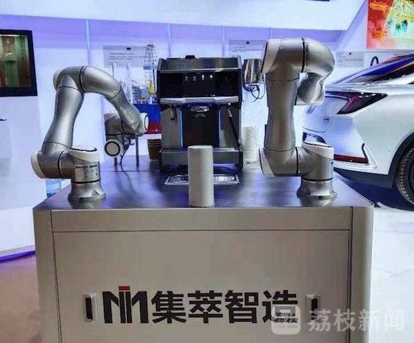 由江苏集萃智能制造技术研究所自主研发的双臂协作“手”冲咖啡机器人也是展厅里引人注目的“大明星”了。它可以精准复现咖啡师的专业调配和拉花手法,一次性完成研磨、加奶、冲泡和调制的咖啡制作全流程。