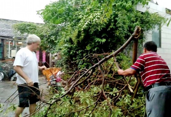 暴雨造成市区部分路段积水、树木折断或倒伏。环卫工人紧急出动,帮助排水,并清除积水退去后路面淤泥、杂物,呵护市民出行。