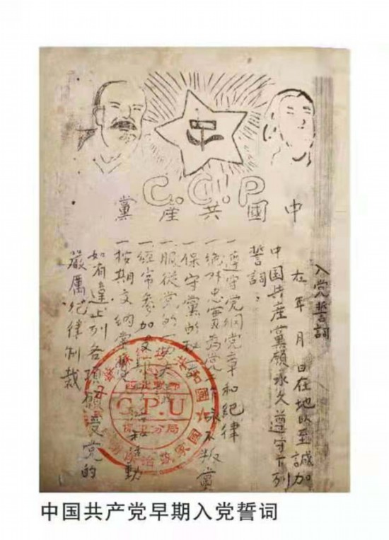 “七一”前夕,工人师傅在仪征市十二圩钱庄三行办事处老屋进行修缮时,在墙缝里意外地发现了一个包裹,打开一看竟是一份入党誓词,上面印有马克思和列宁的头像,入党誓词写着:“一、遵守党纲党章和纪律;二、绝对忠实为党工作永不叛党;三、保守党的秘密;四、服从党的一切决议;五、经常参加支部生活和活动;六、按时交纳党费。如有违上列各项愿受党的严厉纪律制裁。”誓词内容上还加盖了“中华苏维埃共和国国家政治保卫局保卫分局西北制印”的大红公章。据了解,在福建长汀博物馆也保存着这样一份入党誓词。