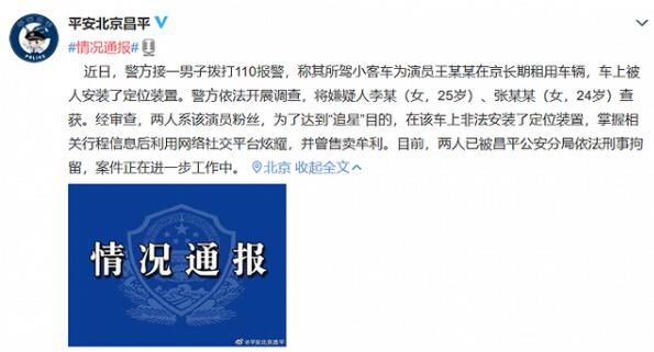 经审查,两人系该演员粉丝,为了达到“追星”目的,在该车上非法安装了定位装置,掌握相关行程信息后利用网络社交平台炫耀,并曾售卖牟利。目前,两人已被昌平公安分局依法刑事拘留,案件正在进一步工作中。