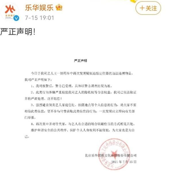 此前,7月15日晚,乐华娱乐在其微博发布严正声明称,再次在王一博车内发现疑似跟踪器的违法违规物品,已报警处理。