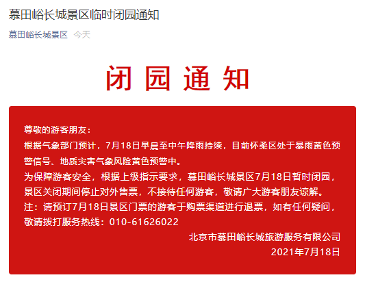 为保障游客安全,根据上级指示要求,慕田峪长城景区7月18日暂时闭园,景区关闭期间停止对外售票,不接待任何游客,敬请广大游客朋友谅解。