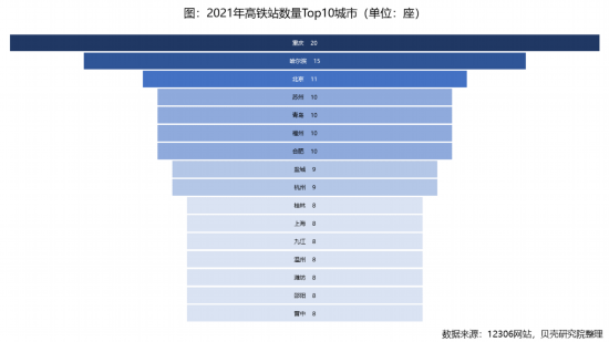 7月16日,贝壳研究院发布的《四通八达VS川流不息,哪种高铁城市更繁荣?》研究报告显示,全国339个城市中,重庆高铁站数量居首,高铁站数量top10城市中,长三角有5城入榜。