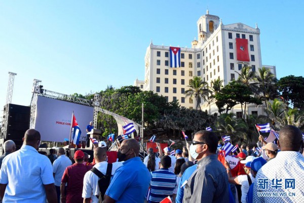 7月17日,民众在古巴首都哈瓦那参加爱国集会。新华社发(华金·埃尔南德斯摄)