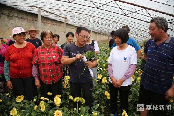 “非洲菊叶片上这种类似地图样的斑纹,是斑潜蝇幼虫造成的,危害十分大,发现后要及时摘去病叶,用阿维菌素溶液进行喷洒,间隔2-3天喷一次,2-3次就能有效防治。”7月16日下午,在连云港市赣榆区金山镇赵湖村花卉基地鲜花大棚内,园艺师张健正在这里为村民们现场讲授花卉种植知识。