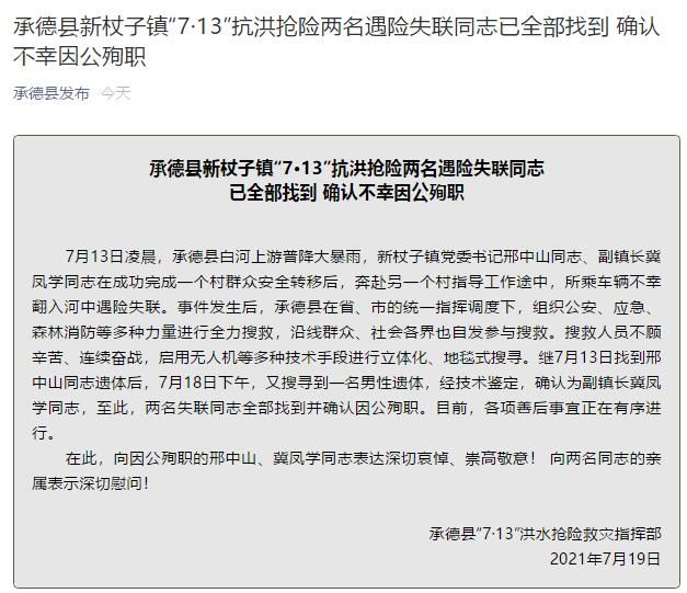 荔枝新闻讯 据中共承德县委宣传部微信公众号消息,7月19日,承德县“7·13”洪水抢险救灾指挥部称:承德县新杖子镇“7·13”抗洪抢险两名遇险失联同志已全部找到,确认不幸因公殉职。