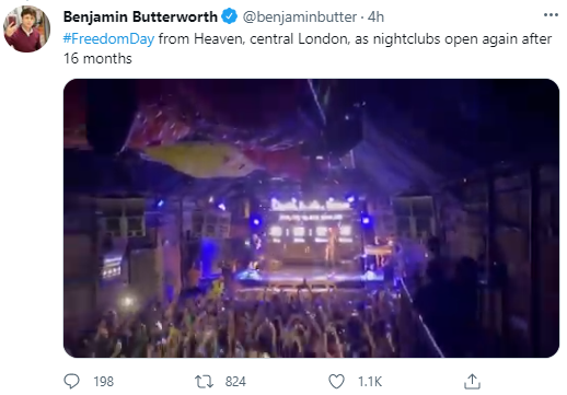 在伦敦中部,有一位记者在推特上分享了当地一家夜店的狂欢视频,视频中人们随着音乐节奏上下跳动。
