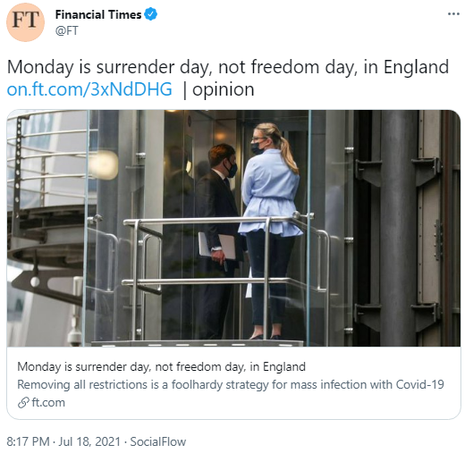 英国《金融时报》似乎也不赞同解封做法,曾在18日发表相关评论。↓