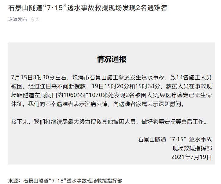 荔枝新闻讯 据珠海发布微信公众号消息,7月15日3时30分左右,珠海市石景山施工隧道发生透水事故,致14名施工人员被困。经过连日来不间断搜救,19日15时20分和15时38分,救援人员在事故现场距隧道左洞洞口约1060米和1070米处发现2名被困人员,经医疗鉴定已无生命体征。我们向不幸遇难者表示沉痛哀悼,向遇难者家属表示深切慰问。